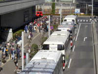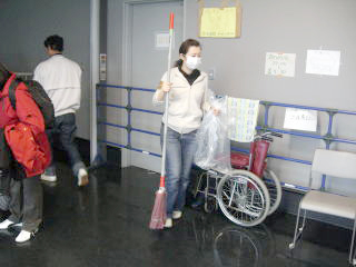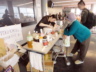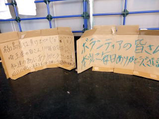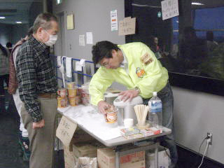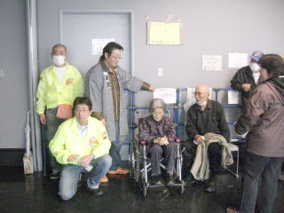 この頃、訪ね人が多く、人捜しが増えた。他のフロアーから捜しに来た人や、こちらに住む親戚や知人が訪ねて来る。方法はダンボールに名前を書き、掲げながら大声で捜すのが一番。和田氏はこれで何人も再会させた。神輿で鍛えた声が思わぬ所で功を奏した。涙で抱き合う様子は、こちらも胸が熱くなる。3日目あたりから、体調をくずすお年寄りが目立ち、救急車で搬送される方もいらっしゃる。環境が変わり、精神的にもストレスが徐々にたまる。足をちょっと踏まれただけで当たり散らす男性も。気持ちは痛いほど分かる。話しを聞いてあげ、事なきを得る。今さらだが、会話をすることで気持ちも少しは和らげるのだと気づかされた。そして、生活物資は勿論、とりまく環境や諸問題も日毎に変わる事もわかった。「昼間は館内の電気を消して、もったいないよ」と冷静なおばさんも。顔なじみになった浪江町のお父さんは、「阪神大震災の時は仕事でガスの復旧工事に行ったが、まさか自分がこうなるとは… とにかく今は浪江の情報が欲しい」。4月からはさいたま市北区の施設に移るという。