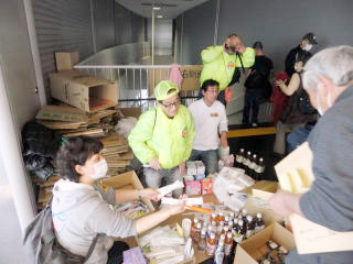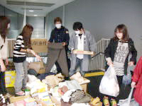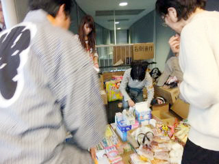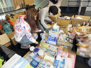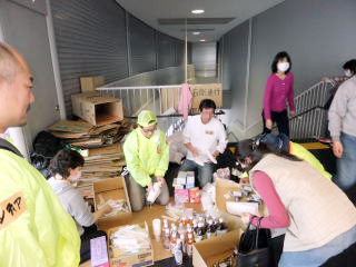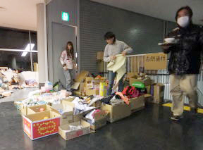 二日目からは、日常の生活とはいえないが、落ち着きが戻った感じ。5階フロアに生活用品、衣料品、食料、カップ麺を並べ、利用してもらうスペースを設けた。これで階下まで行かなくても用が足ります。若手がダンボールで工夫しながら、分かり易く分類してくれた。ボランティア作業にあたり、必携品はメモ、ペン、マジック、ガムテープ、カッター、軍手、マスク、タオル、飲料水など。リュックにまとめる。基本的に手弁当だが、余ったパン、お弁当をご馳走になった。食事は2階までダンボールトレーで取りに行くのだが、長い距離で階段がきつそう。「豚汁がこぼれて半分になってた(笑い)」「うちらは食べれるだけ幸せだよ。よそじゃ、食料届かない避難所あるんだから」。