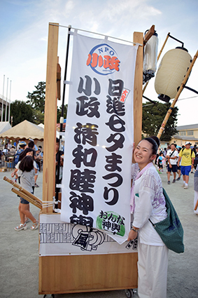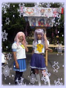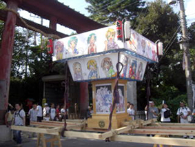 今や1500人の担ぎ手が集まる県内屈指のお祭りとなりました。関東最古の鷲宮神社と土師祭千貫神輿は有名だが、ここ数年はアニメ“ラキスタ”の舞台として全国的になりました。週末には多くのファンが神社を訪れて参拝します。今回もラキスタ万燈神輿が全国から集まったファンによって担がれました。メディアも多数取材にみえ、ニュース等で放映されました。大柄のド派手なセーラー服姿のファンに声をかけると、快く撮影に応じてくれました(もちろん男性)。